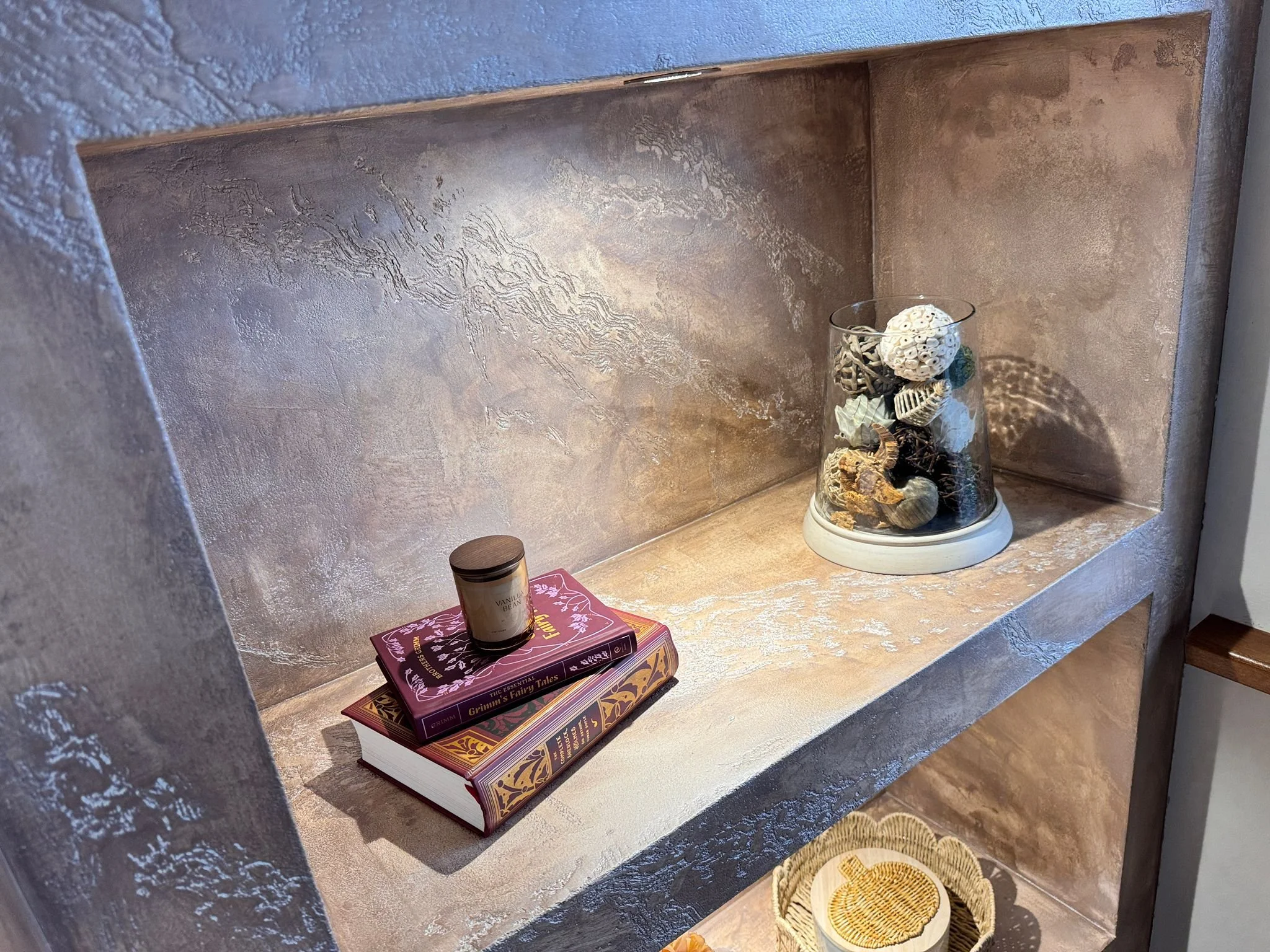 Witness the meticulous process of creating a textured, totally bespoke stone effect—handcrafted to your exact specifications. This exclusive finish provides the dramatic, organic appeal of natural stone with a unique texture that cannot be replicated, giving your space an unparalleled depth and character.